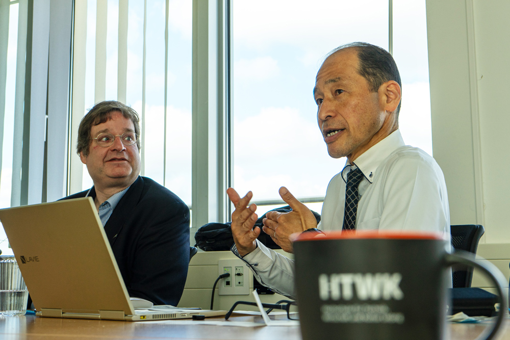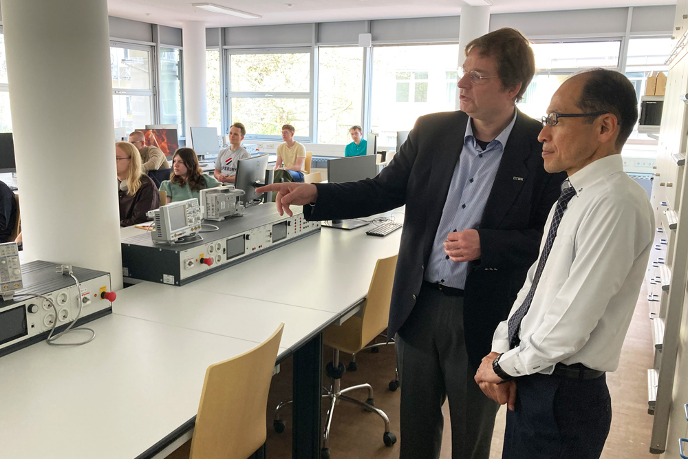 Am Besuchsprogramm nahmen seitens der HTWK Leipzig außerdem Prof. Dr.-Ing. Michael Einhaus, Studiendekan für den Masterstudiengang Information- und Kommunikationstechnik der Fakultät Digitale Transformation, und Silke Mühl vom Akademischen Auslandsamt teil. Bei einer kurzen Tour durch die Labore der Fakultät bekam Nakada einen guten Einblick in verschiedene Tätigkeits- und Forschungsbereiche, beispielsweise das Labor für Elektromagnetische Verträglichkeit, das Grundlagenlabor für Elektrotechnik sowie das Forschungsfeld des HTWK Robots Teams. Beide Seiten sehen der Weiterentwicklung der jungen Kooperation entgegen und freuen sich auf zukünftige weitere Forschungsprojekte und akademische Austauschformate.