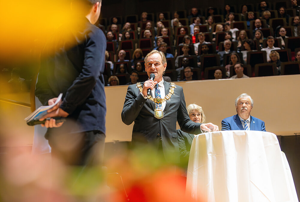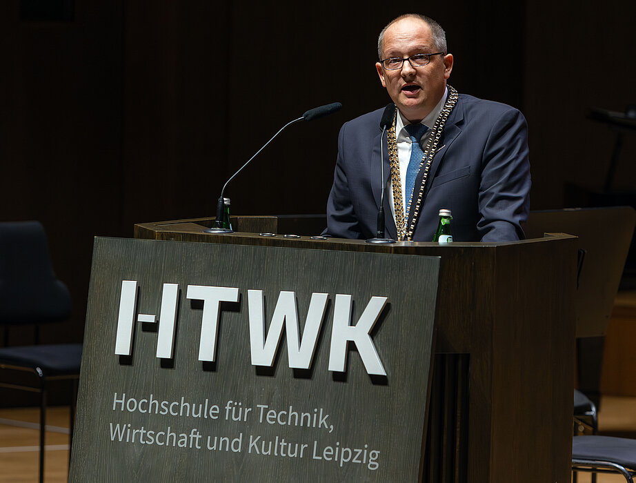 HTWK-Rektor Prof. Mark Mietzner lud in seiner Begrüßung die Studierenden zu einer „akademischen Reise“ ein, die das Studium darstelle. Er ermutigte sie, in Zeiten des Wandels sie die gesellschaftlichen Herausforderungen anzugehen und Lösungen zu finden. Die HTWK Leipzig sein ein Ort des Zusammenkommens, des gemeinsamen Forschens, Lernens und Anwendens.